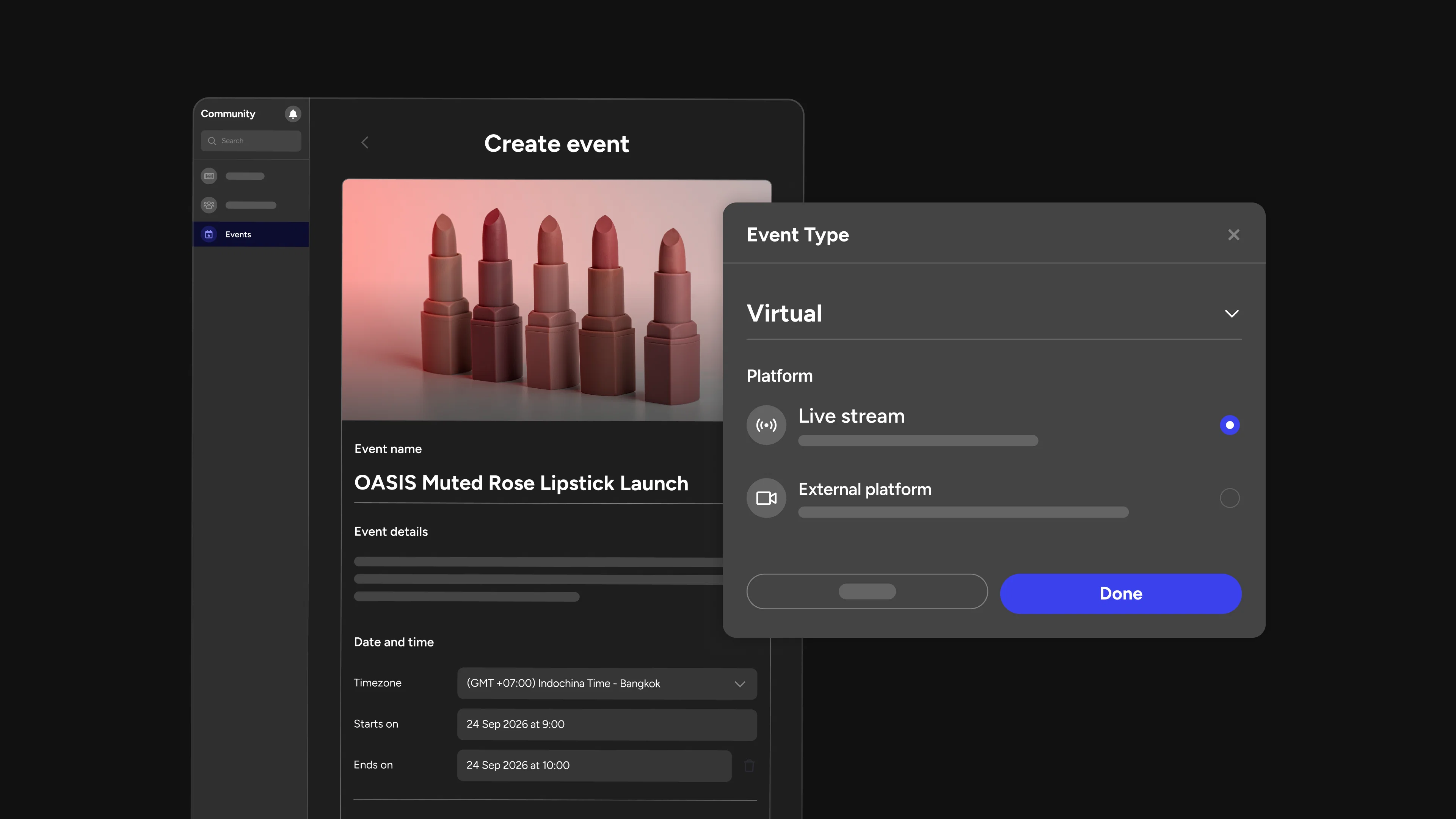 Creating an event is as simple as it should be. Community managers can schedule events directly from the social.plus console. Configure the name, description, date and time, and choose the format: in-person, digital, or livestream. Every event is configured, published, and managed in one centralized place.