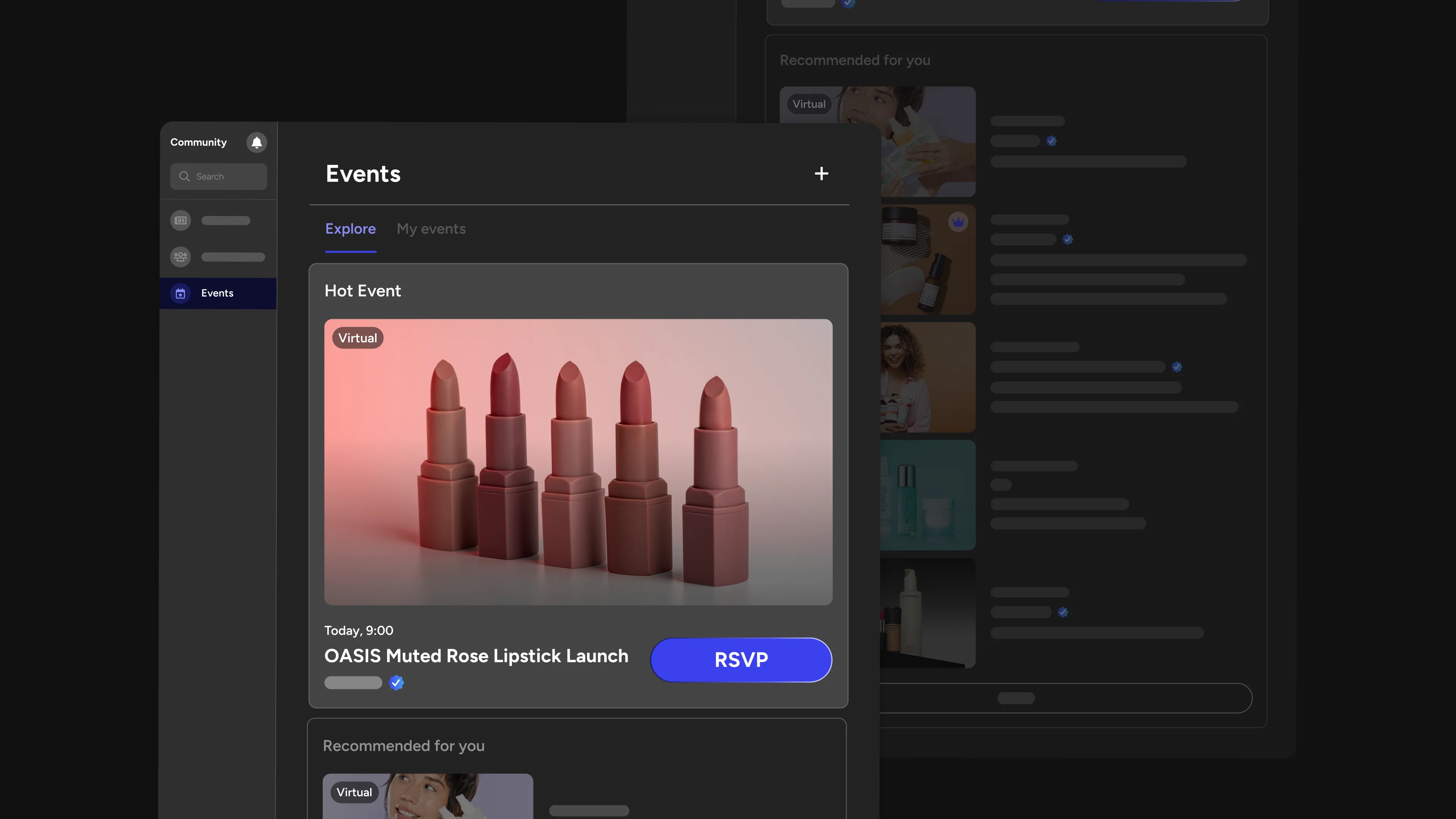 One of the biggest reasons community engagement drops off is that members simply don't know what's happening. Events solves that with a dedicated events feed where members can browse upcoming events, revisit past ones, and explore what's live right now, both across the platform and within specific communities.