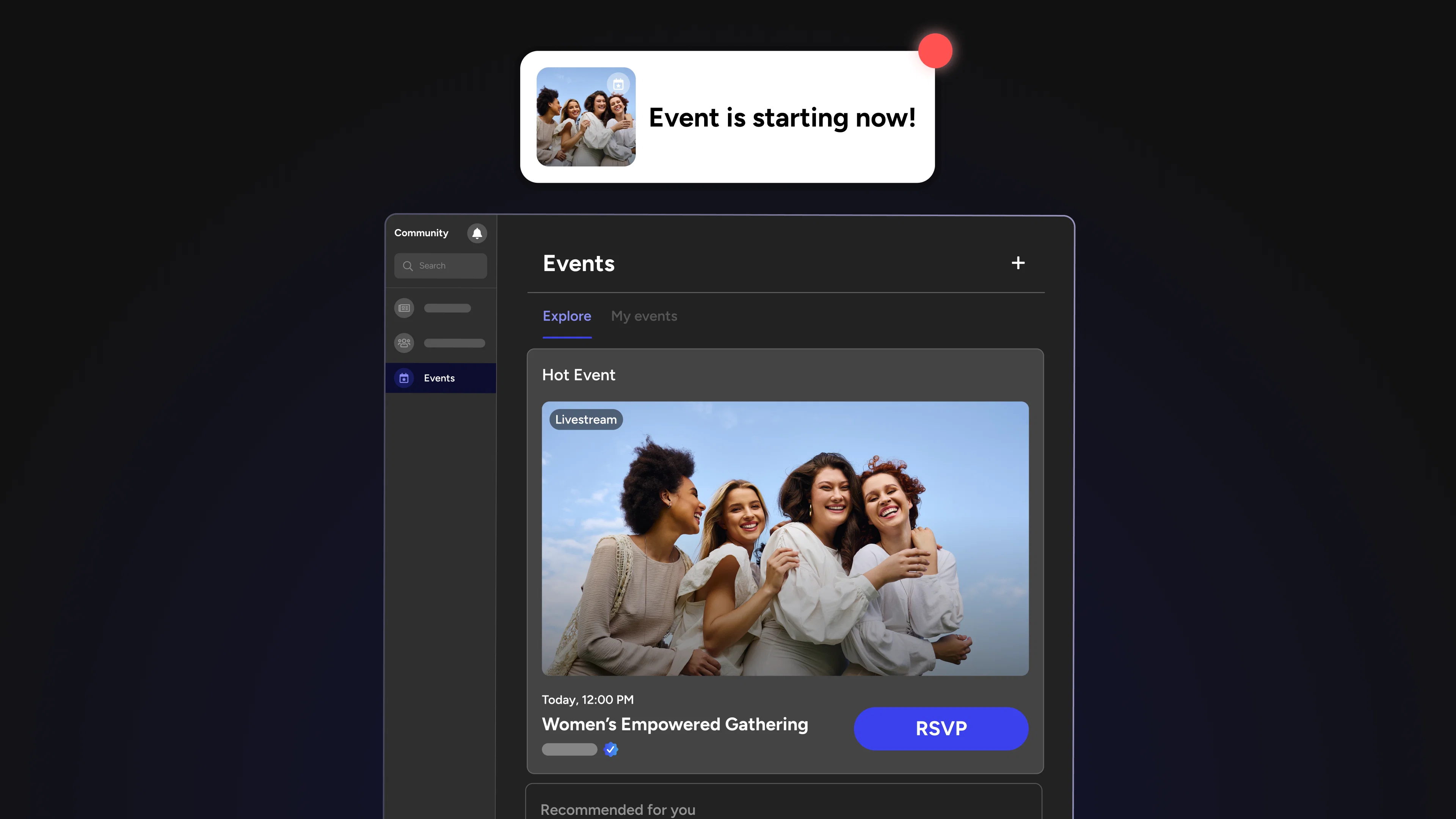Make the event discoverable after the fact. An events feed that surfaces past events alongside upcoming ones lets members who discover the community later see what has already happened. That signals an active, programmed community rather than a dormant one, and it is part of what turns first-time visitors into members.