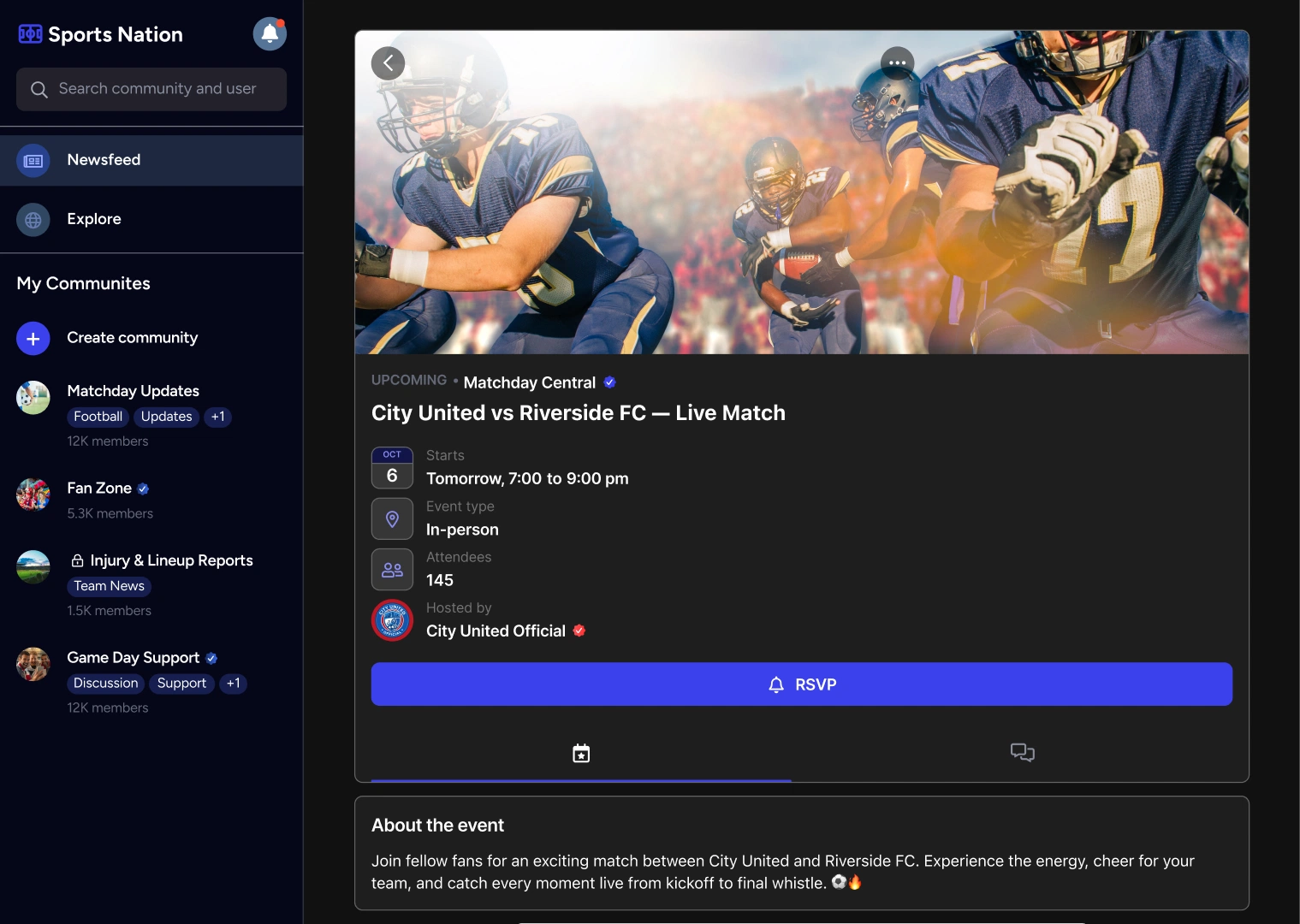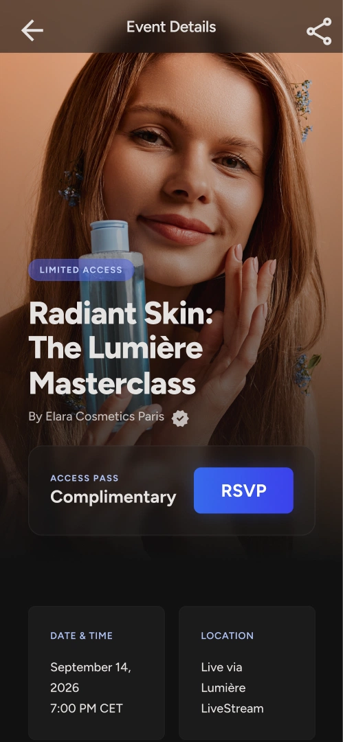 Discovery, RSVPs, Live Streams, and Analytics stay inside your app where your users already are.