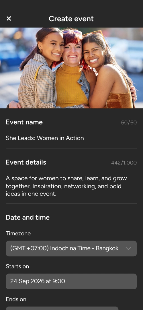 Events is the moment layer of your community. It gives every platform the infrastructure to create, host, and manage live and scheduled moments from discovery and RSVPs to going live. Events gives members a reason to show up at a specific time. Paired with Live Stream, it becomes a full broadcast experience that makes your platform the place where things actually happen.