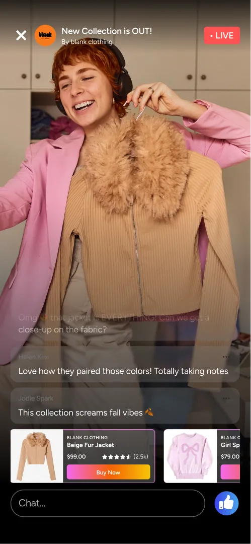Livestream enables real-time video broadcasting directly inside your app. Hosts can go live while audiences watch, react, and engage through chat and interactions. Whether used for commerce, fitness, entertainment, or events, livestreams create urgency, authenticity, and a strong sense of connection between hosts and viewers.
